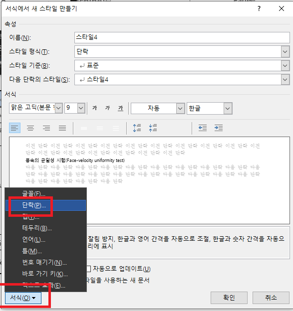 서식에서 단락을 선택한다
