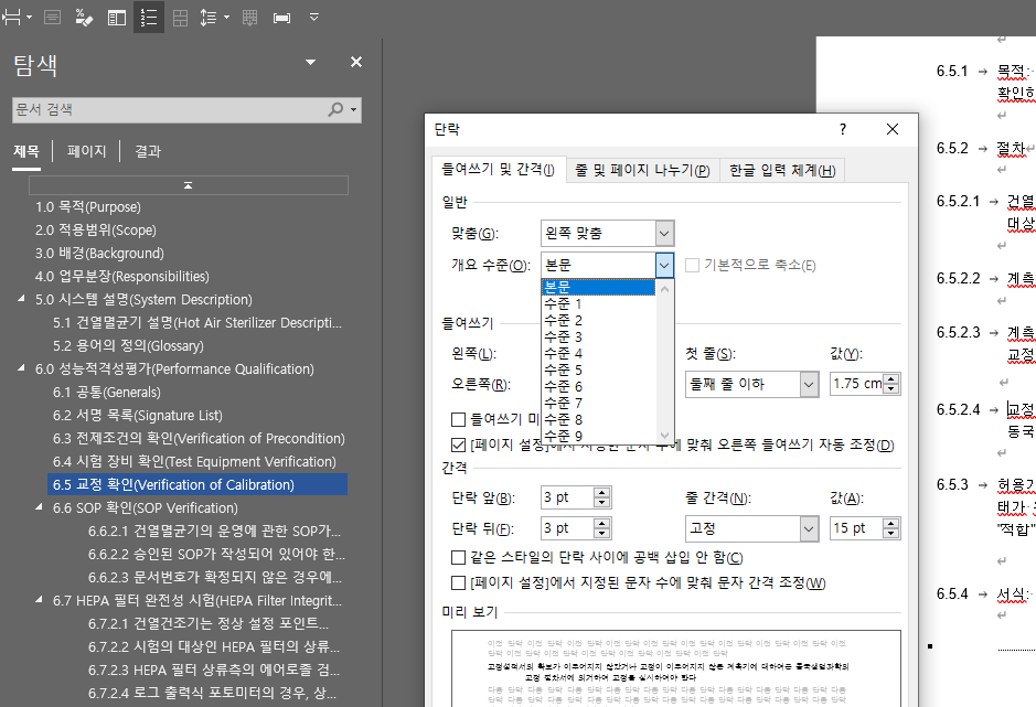 위와같이 단락의 개요 수준을 본문으로 변경하면 된다.